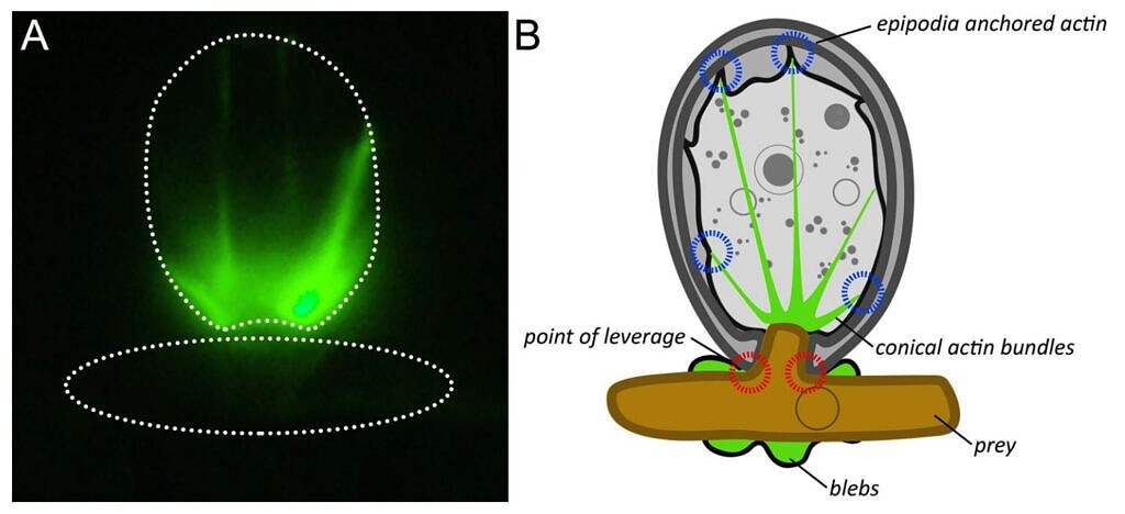Evidently, the conical bundles of actin shown in the images on the left are used “to exert force on the cell walls of the amoeba’s prey while being anchored to the inner shell surface.” The mechanism of the force is not fully explained at the molecular level, but it seems these actin bundles act somewhat like cables in a winch (presumably driven by contractile proteins, such as myosin?). One end of the actin bundle is firmly attached to the inside of the shell, and the other is affixed to a tasty prey organism. As the victim is pulled into the shell, its membranes or cell walls are broken open on the rim of the aperture.