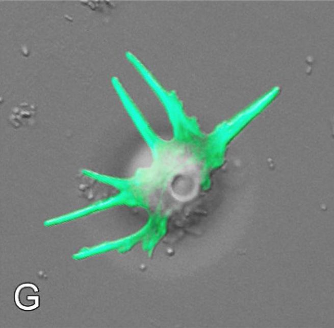 This insight hinges partly on the behaviour of a protein called “filamentous actin”, a substance that enables amoeboid cells to move forward by extending pseudopods. When a pseudopod forms at the leading edge of the cell, long chains of f-actin molecules rapidly polymerize within it, forming an inner scaffolding of filaments that push the pseudopod out. Then, as the pseudopod is retracted, this scaffolding is quickly disassembled and sections of filamentous actin are pulled back into the body of the cell, with the help of myosin motor proteins.