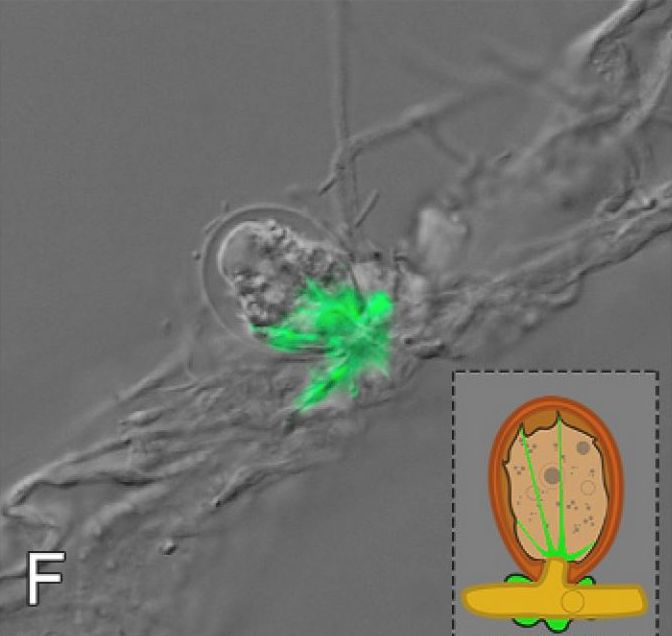 According to the authors, the actin filaments are anchored on the walls of the shell itself, within the strands of cellular matter traditionally called epipodia (attachment points for the organism, within its test). This is where the shape and structure of the shell–including its aperture–becomes important. In the model proposed by Dumack and associates, as prey is dragged into the shell to be consumed it is broken across the lip of the aperture. Here’s a helpful pair of images, showing the mechanism by which Cryptodifflugia oviformis breaks open fungal hyphae: