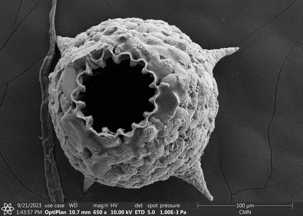 Netzelia corona is a testate amoeba with “teeth” around the aperture of its shell. It also has some impressive spines jutting out from its posterior, which have obvious advantages as a defensive apparatus. But it’s the teeth that have always puzzled me. They’re very neatly made, featuring uniform lobes of organic cement from which tiny, sharp mineral particles protrude.
